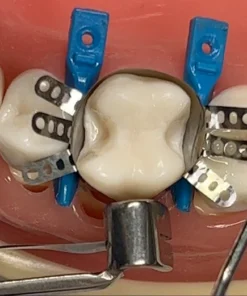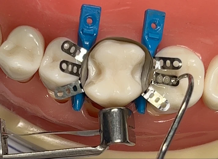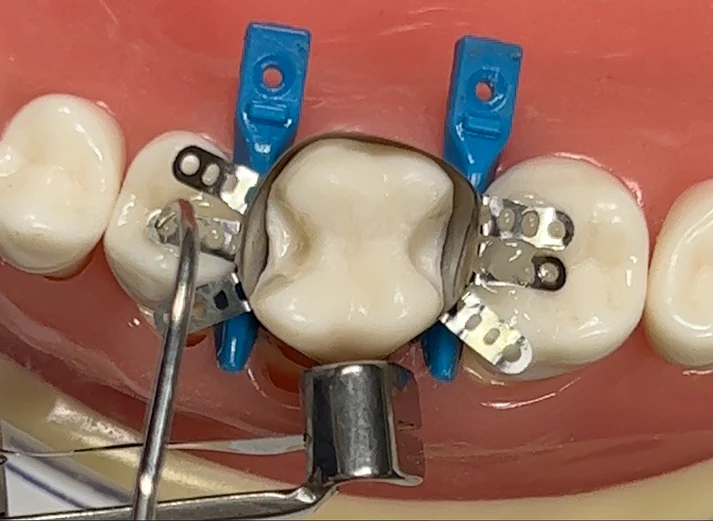 Multiple long tabs on the proximal sides can be, optionally, tacked to adjacent teeth to overcome the inward force created by band tightening. This guarantees that the contacts are tight.